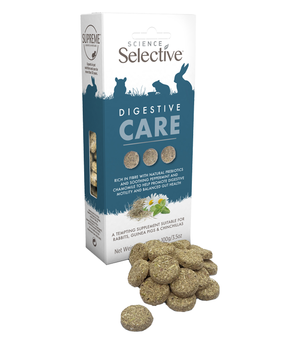 The image shows a packet of Science Selective Digestive Care, a supplement for small pets. The packaging features an image of rabbits on the front, along with the product name