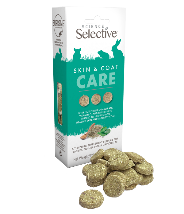 The image shows a packet of Science Selective Skin & Coat Care, a supplement for small pets. The packaging features an image of rabbits on the front, along with the product name