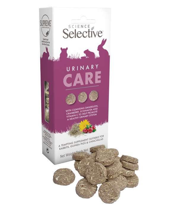 Packaging of Science Selective Urinary Care supplement, featuring three pieces of the supplement. The packaging highlights ingredients such as dandelion, cranberry, echinacea, and vitamin C, promoting a healthy urinary system for rabbits, guinea pigs, and chinchillas. The background is purple, with a silhouette of rabbits and flowers.