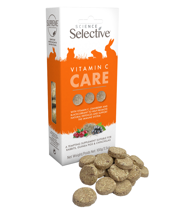 The image shows a package of Science Selective Vitamin C Care, a supplement designed for rabbits, guinea pigs, and chinchillas. The front of the package features an orange color scheme with the product name