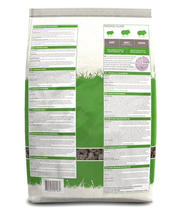 The average adult guinea pig will require 40-50g/day of Selective Guinea Pig Botanicals. Fresh vegetables should also be provided along with good quality hay and clean drinking water. Please store in a cool dry place.